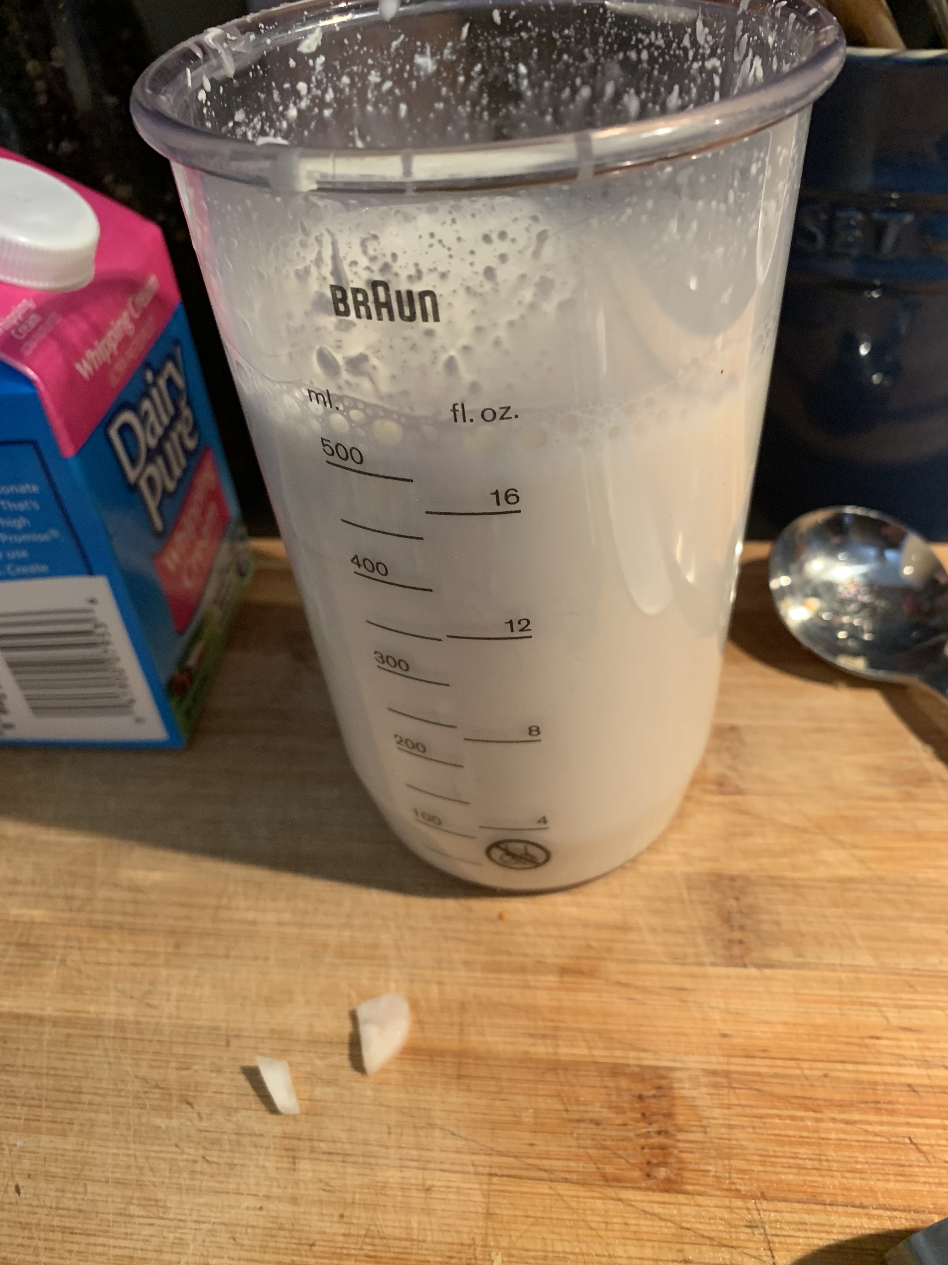 4) Using a blender (I use an immersion blender, easier to clean), mix the cream cheese in the remaining broth to make a creamy/milky looking substance. Once mixed, pour it into the soup pot.