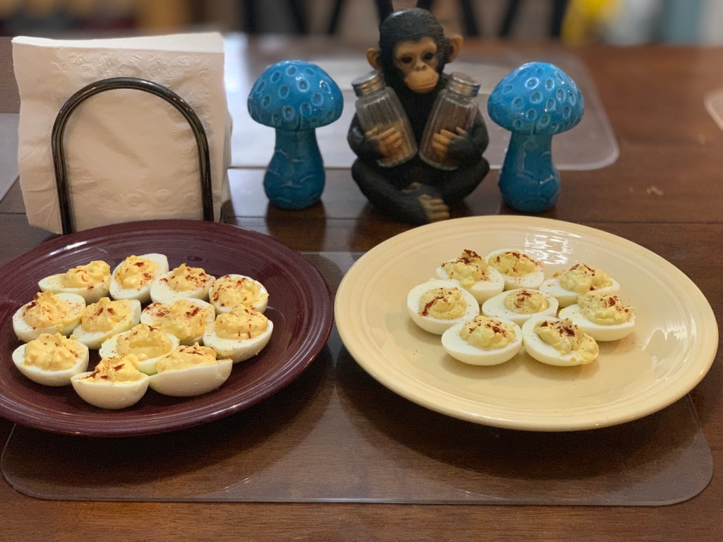 So, some friends turned me on to Nando’s medium Peri Peri sauce and Trader Joe’s Green Dragon sauce. Let me tell you, they are both darn tasty. I decided they would be great additions to deviled eggs.