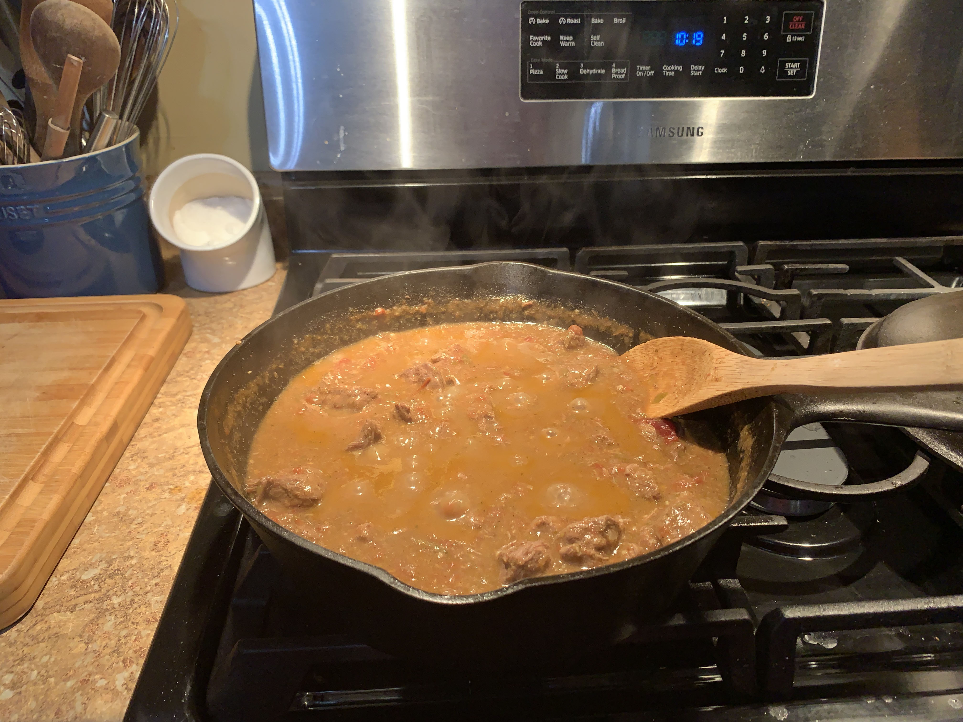 - In a deep pan (preferably cast iron), melt your fat and brown the beef over high heat